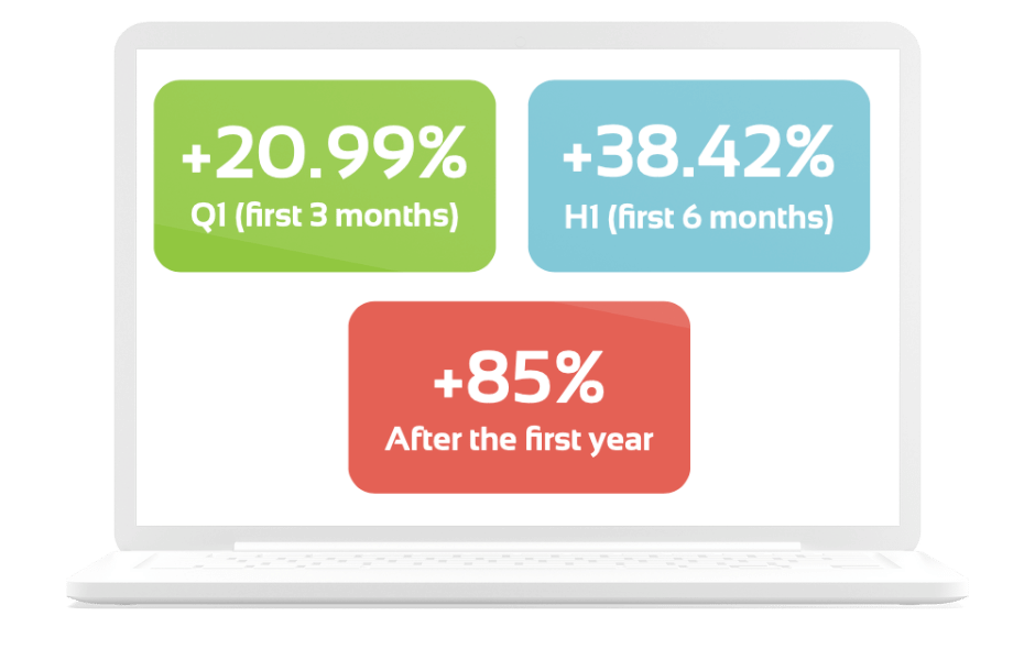 Q1 (first 3 months): +20.99% social followers, H1 (first 6 months): +38.42% social followers, Year 1: +85% social followers
